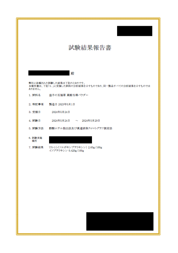 ・科学的証明: 素材の信頼性を確かなものとするため、主要成分である**「YN-1(イソエポキシプテリキシン)」や「イソプテリキシン)」の分析と品質検査を第三者機関に依頼**しています。客観的なデータに基づいた厳格な品質証明が、貴社の製品開発を強力に後押しします。